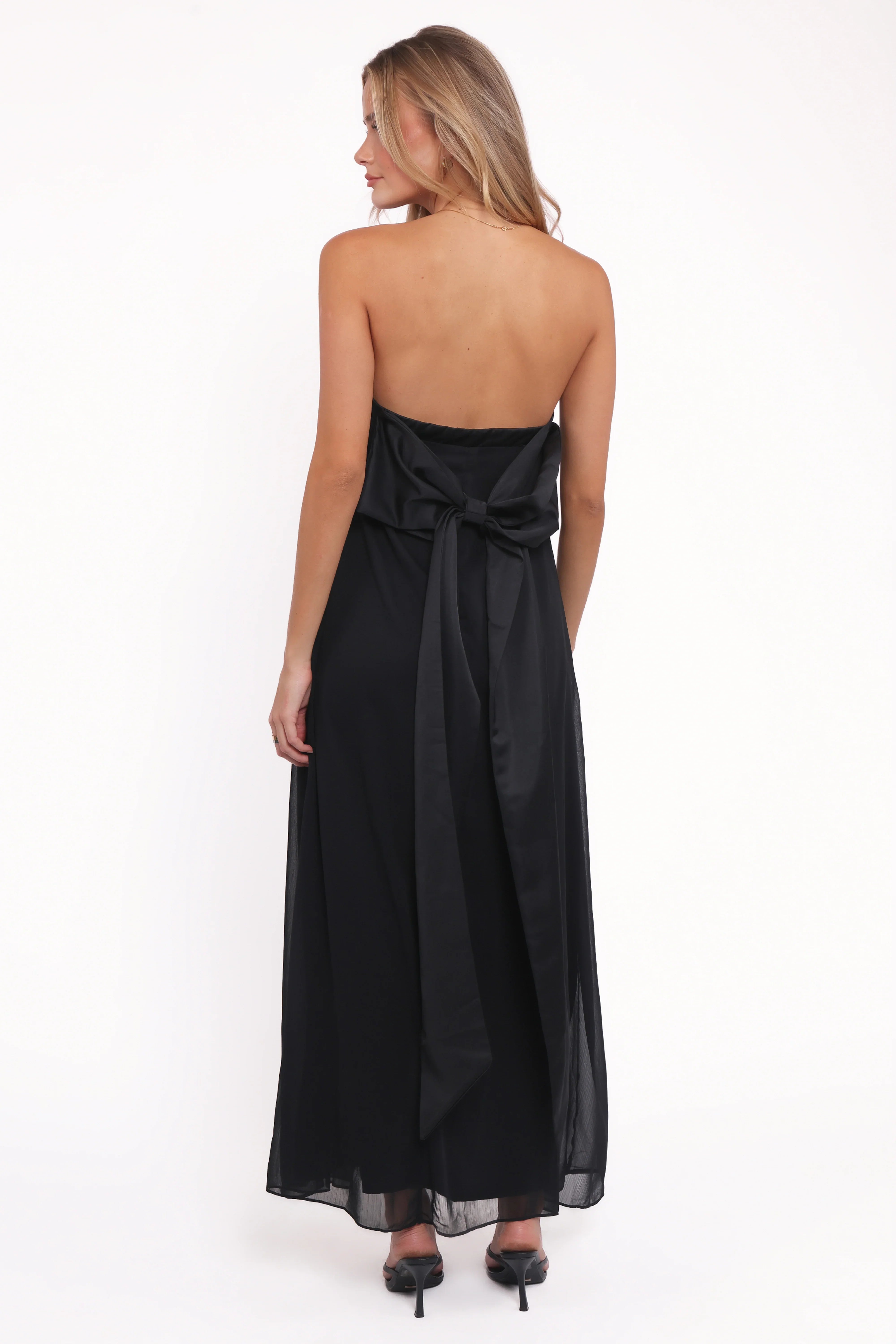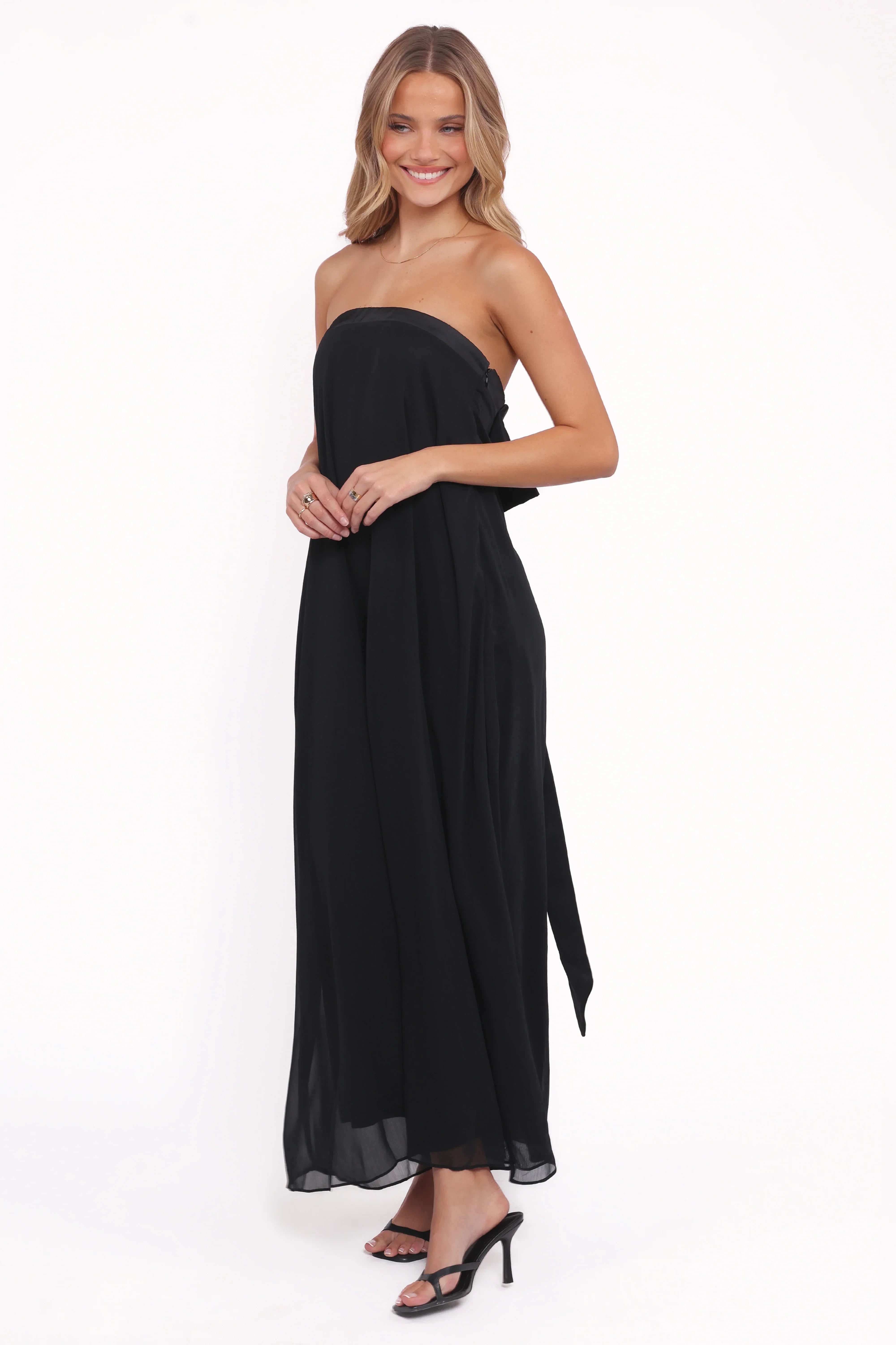 Turn heads and make an unforgettable entrance with the Amici Maxi Dress in classic black. This strapless statement piece features a sleek straight neckline and an inner bust rubber grip to keep you feeling secure and confident all night long.