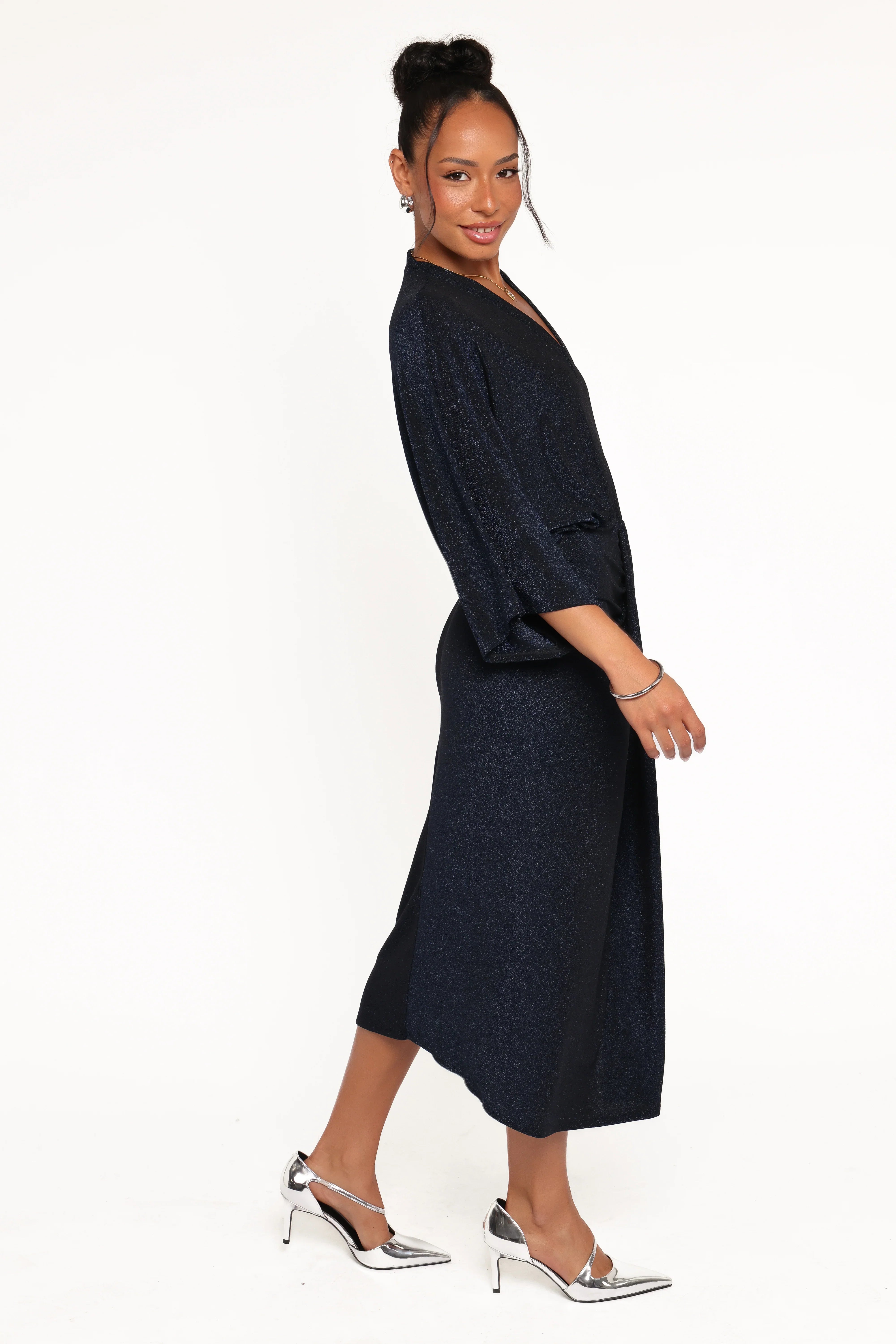 Turn heads and own every room you enter with the Audrina Maxi Dress in stunning Midnight Blue. This show-stopping piece features a flattering v-neckline that beautifully frames your decolletage, while the elasticised waist creates an effortlessly cinched silhouette that celebrates your curves.