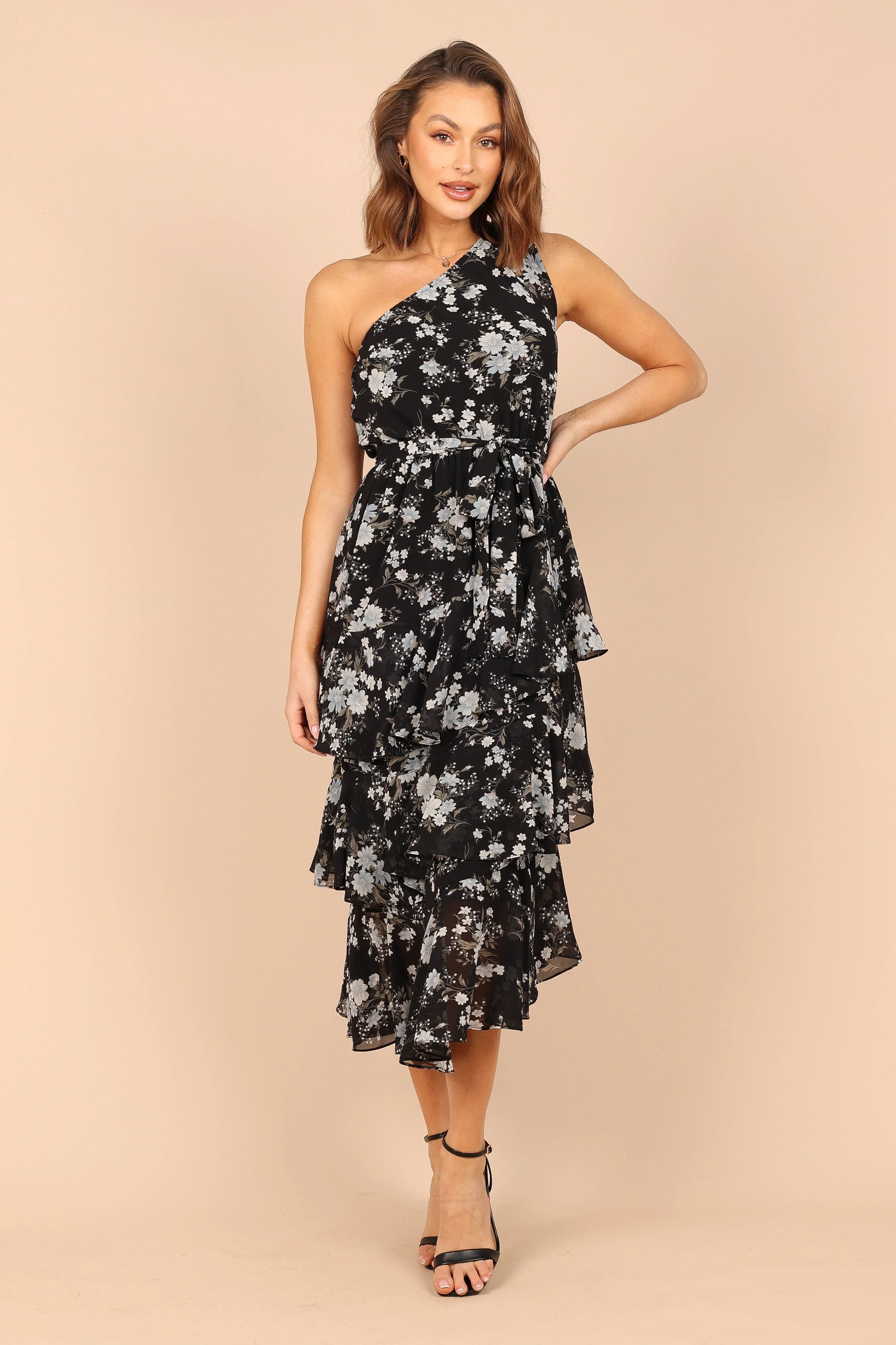 For party season, look no further than this midi-length one shoulder dress! A striking silhouette with an elasticised asymmetric neckline and a drop tier a-line ruffle skirt design, you'll be sure to stand out in the crowd.