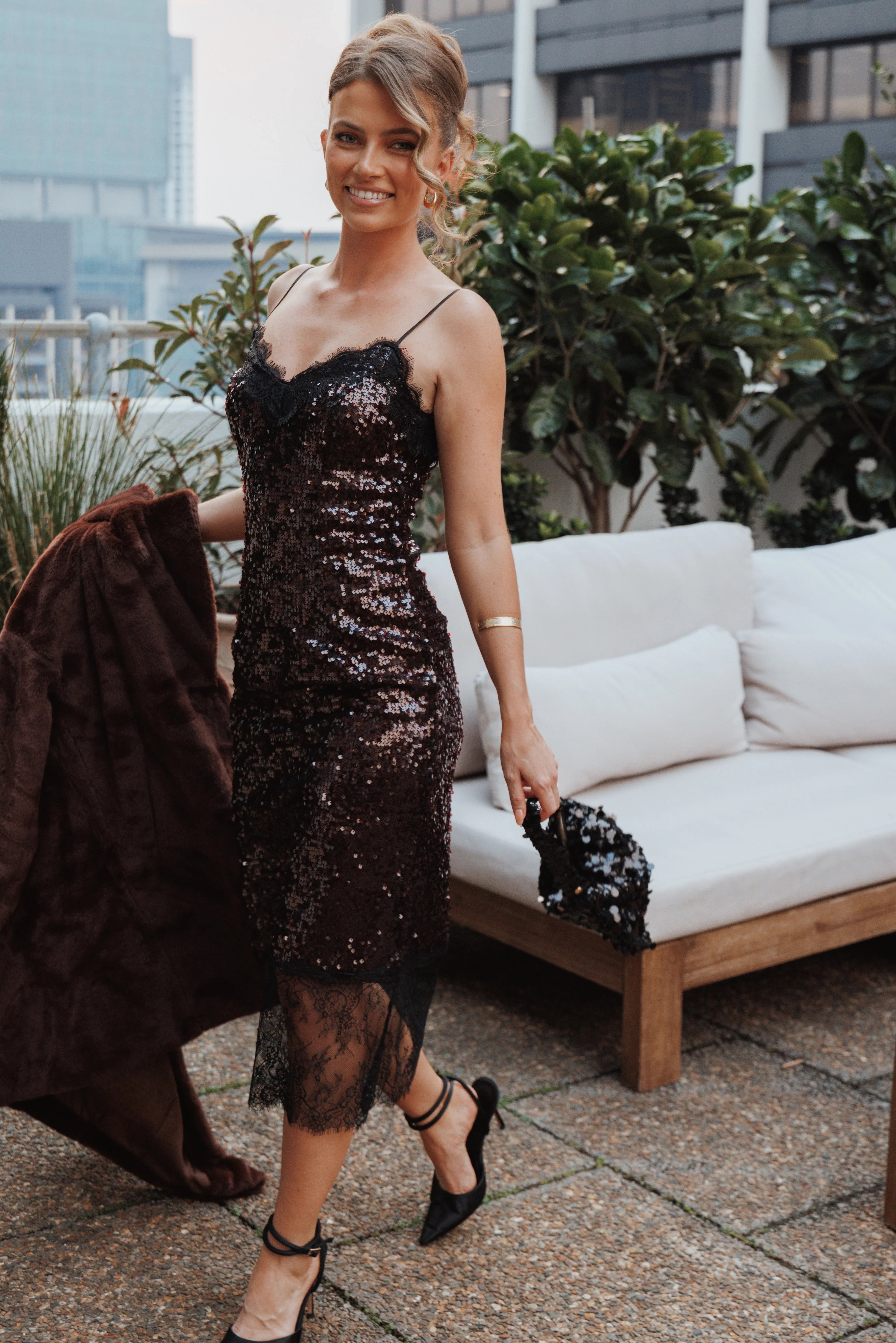 This dress is crafted from a delicate sequin fabrication that catches the light with every move. The flattering v-neckline and intricate lace trim add a touch of romance, while the bodycon fit and midi length create a stunning silhouette.