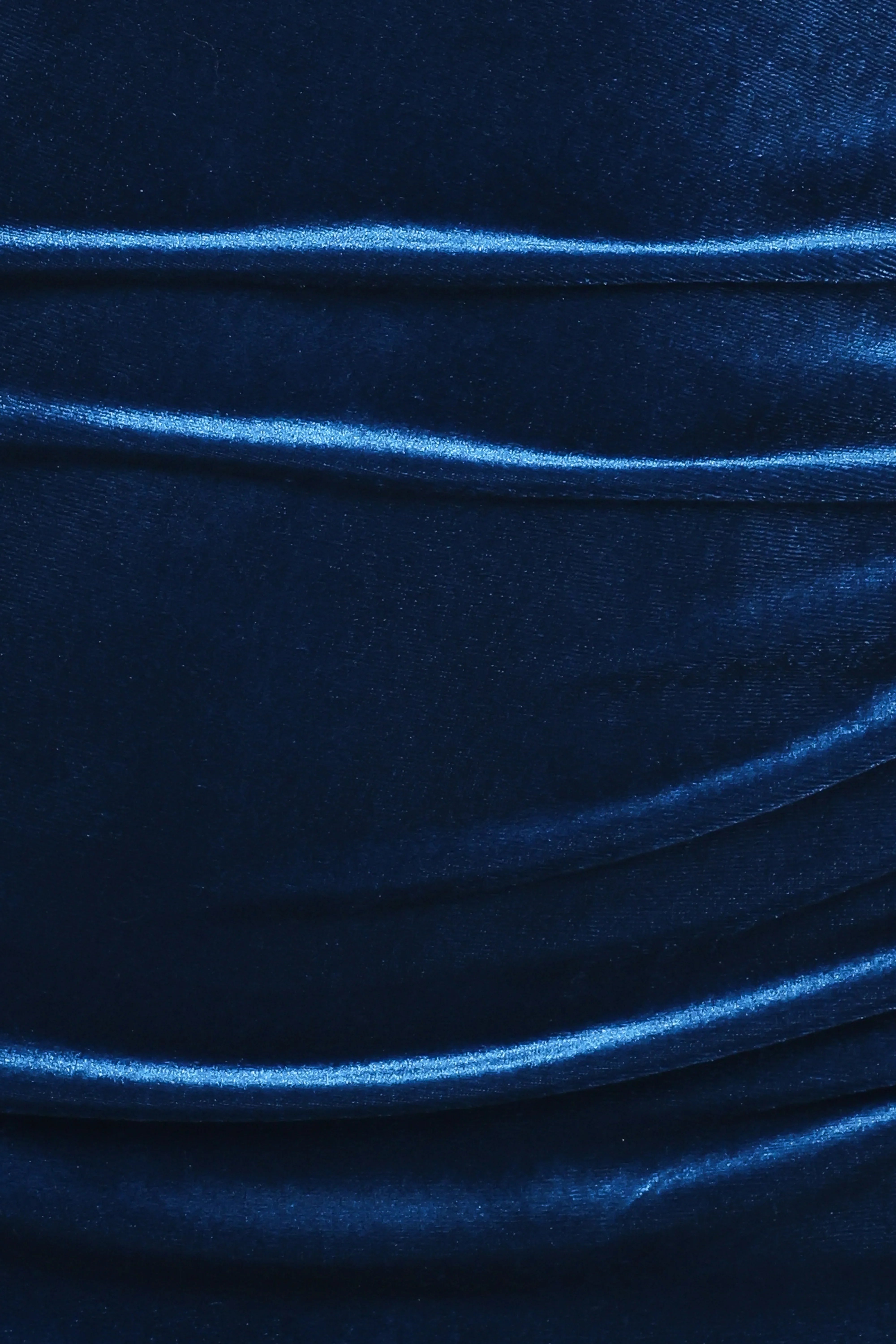 Crafted from soft, luxurious velvet, this dress is designed to make a statement. Its elegant high neckline and full-length silhouette create a sophisticated profile, while the gathered ruched detail at the hip and a daring front split add just the right amount of drama.