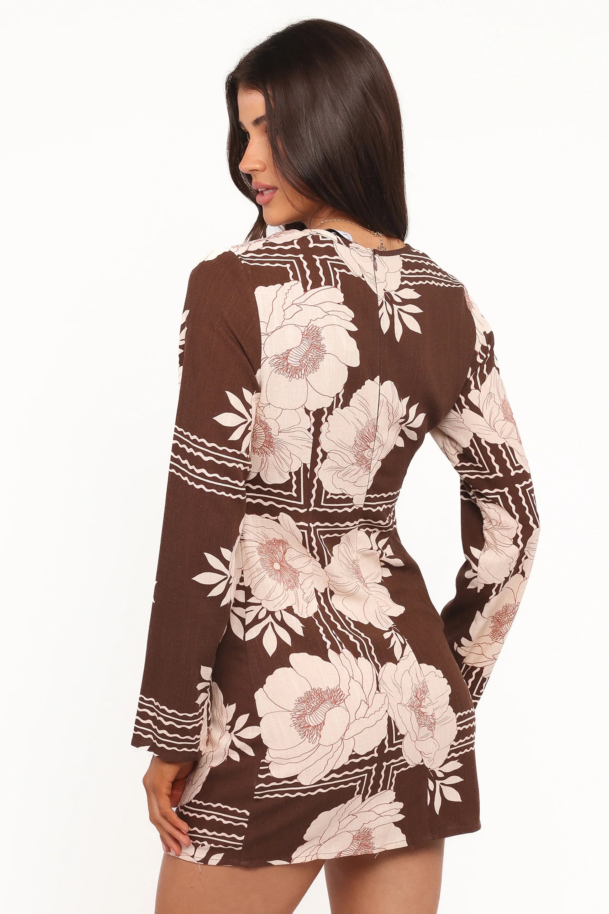 Turn heads with the Marylon Mini Dress in Brown Floral. This gorgeous piece combines trendy sophistication with a touch of vintage-inspired charm. Featuring a flattering mini length, a high neckline, and long sleeves, it's perfect for transitioning between seasons.