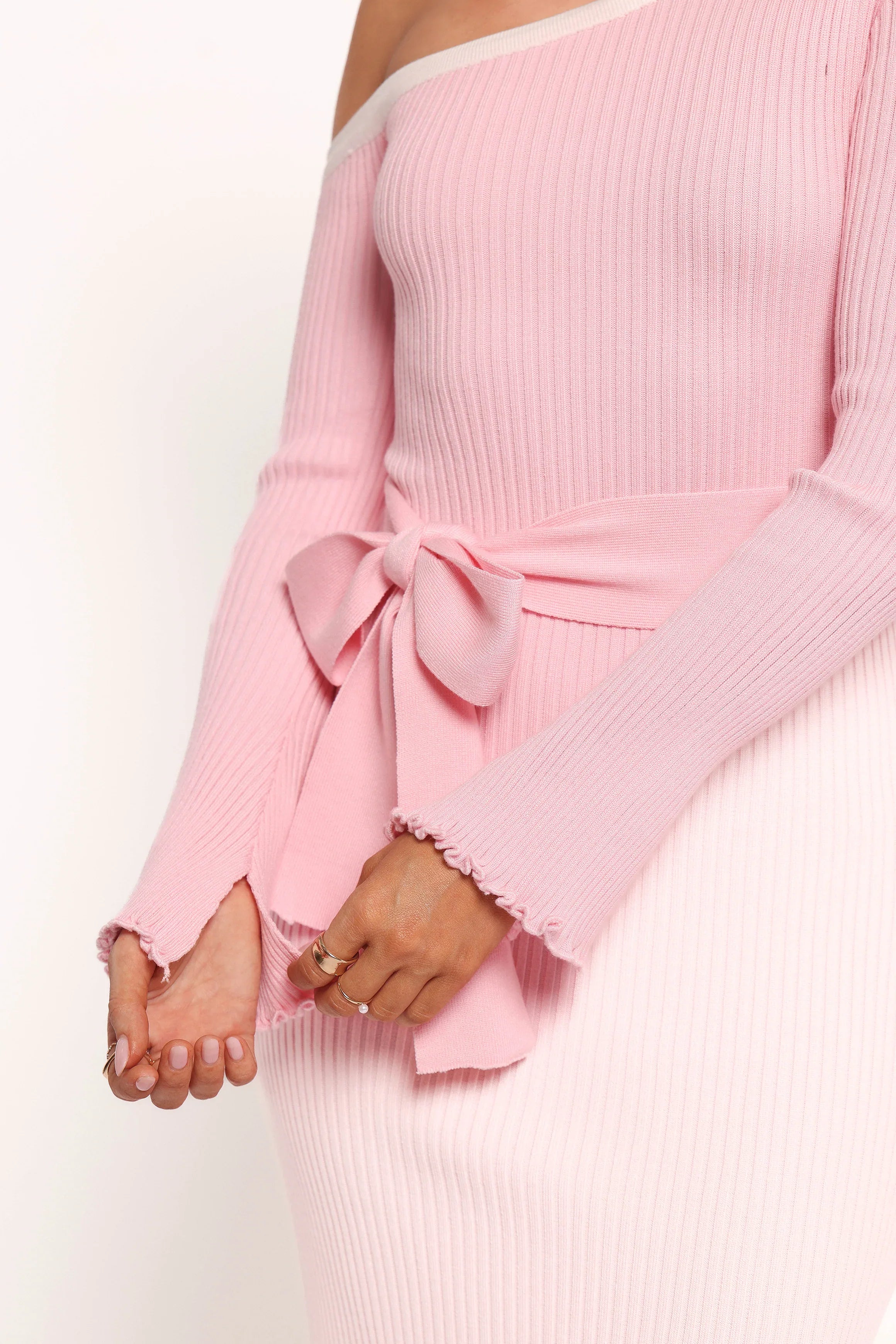 Turn heads with the Milan Off Shoulder Midi Dress in blush pink, your next go-to piece for effortless elegance. With its asymmetric neckline and long flared sleeves featuring split , this dress is all about modern sophistication.