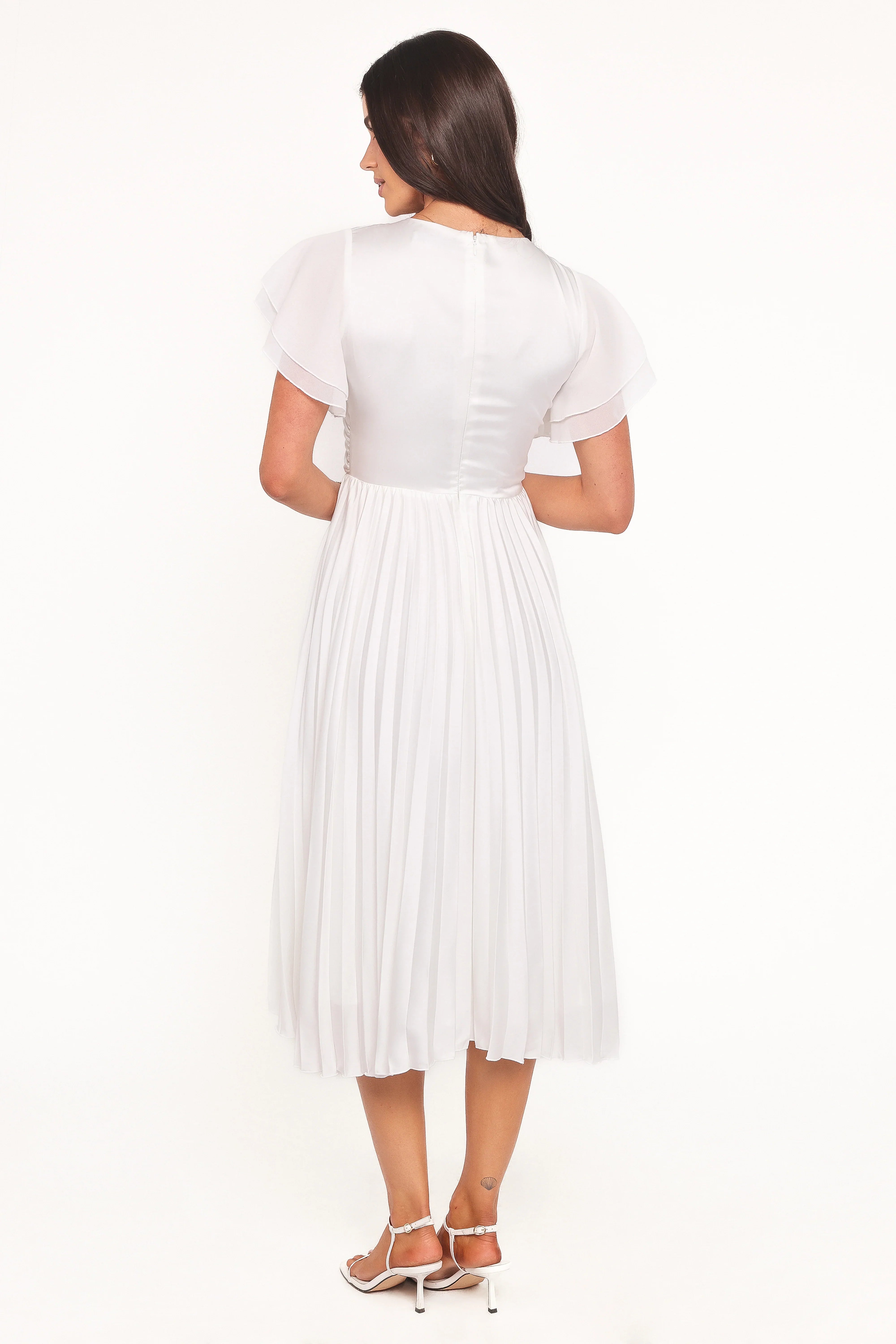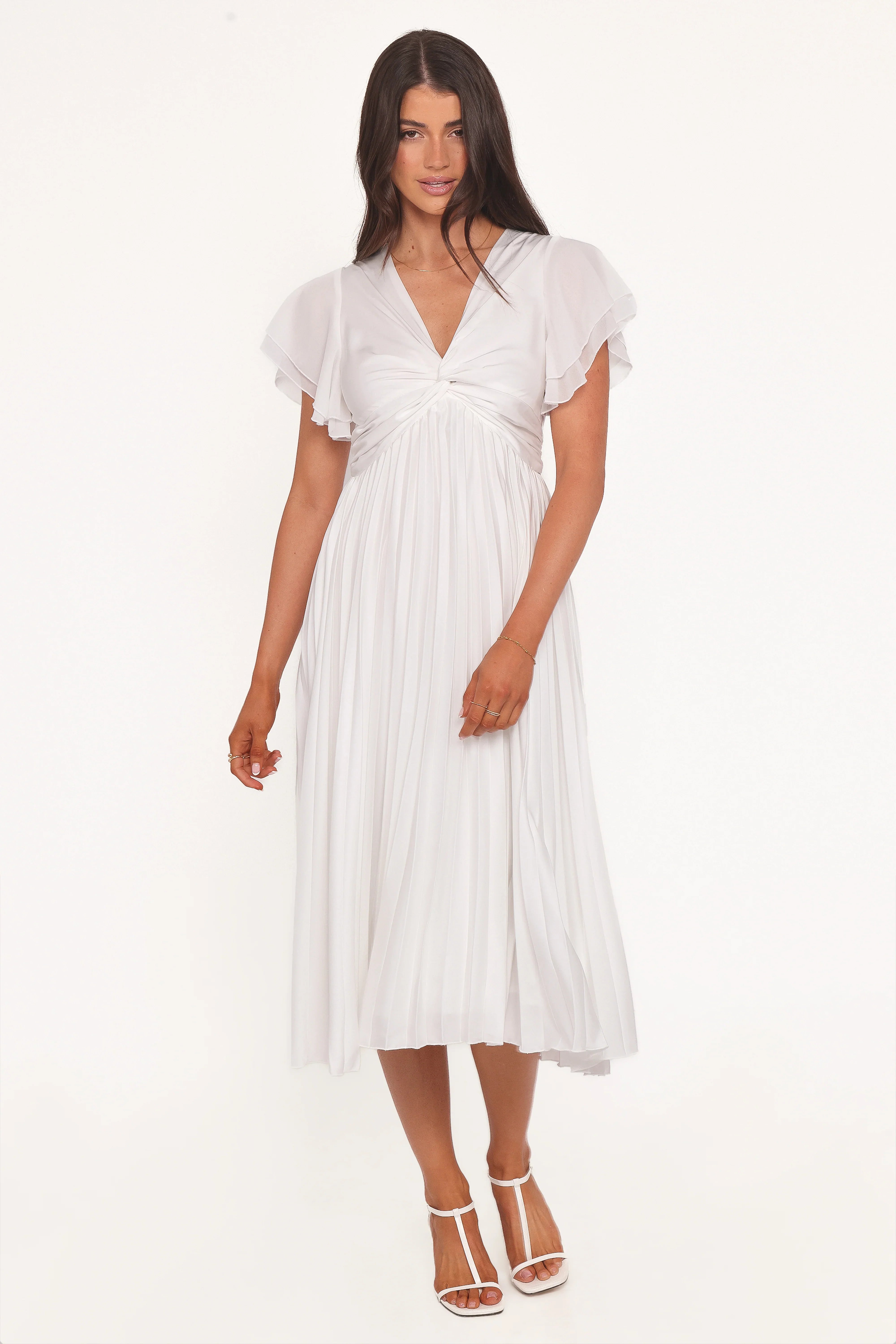 The Nova Flutter Sleeve Dress in White is the ultimate blend of elegance and ease. Its midi length and pleated skirt detail create a timeless silhouette, while the flutter sleeves and v-neckline add a touch of charm. Featuring an invisible back zip with a secure clasp, this dress is as effortless to wear as it is to style.