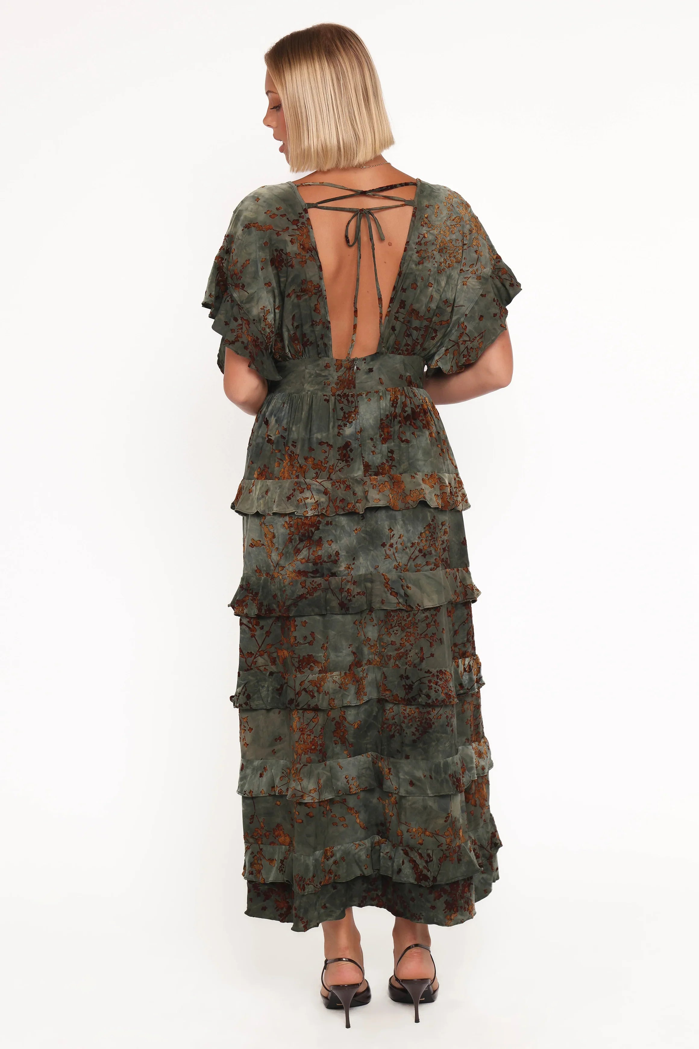 Embrace elegance with our breathtaking maxi dress, boasting a flattering deep V neckline, short sleeves, and a chic tiered skirt. Enjoy the convenience of a functional button-down front, crossover back tie detail, and an invisible back zip with secure hook and eye clasp.